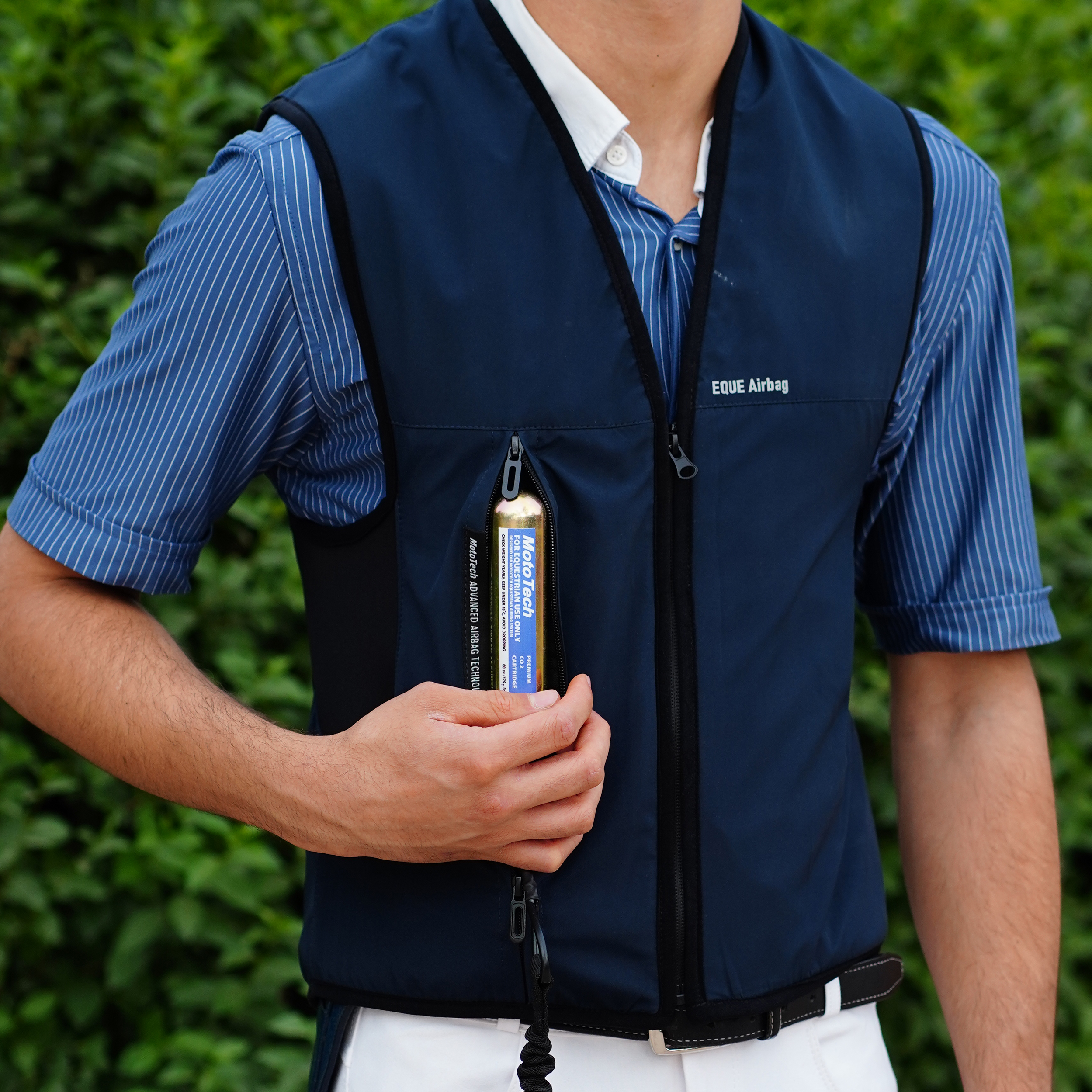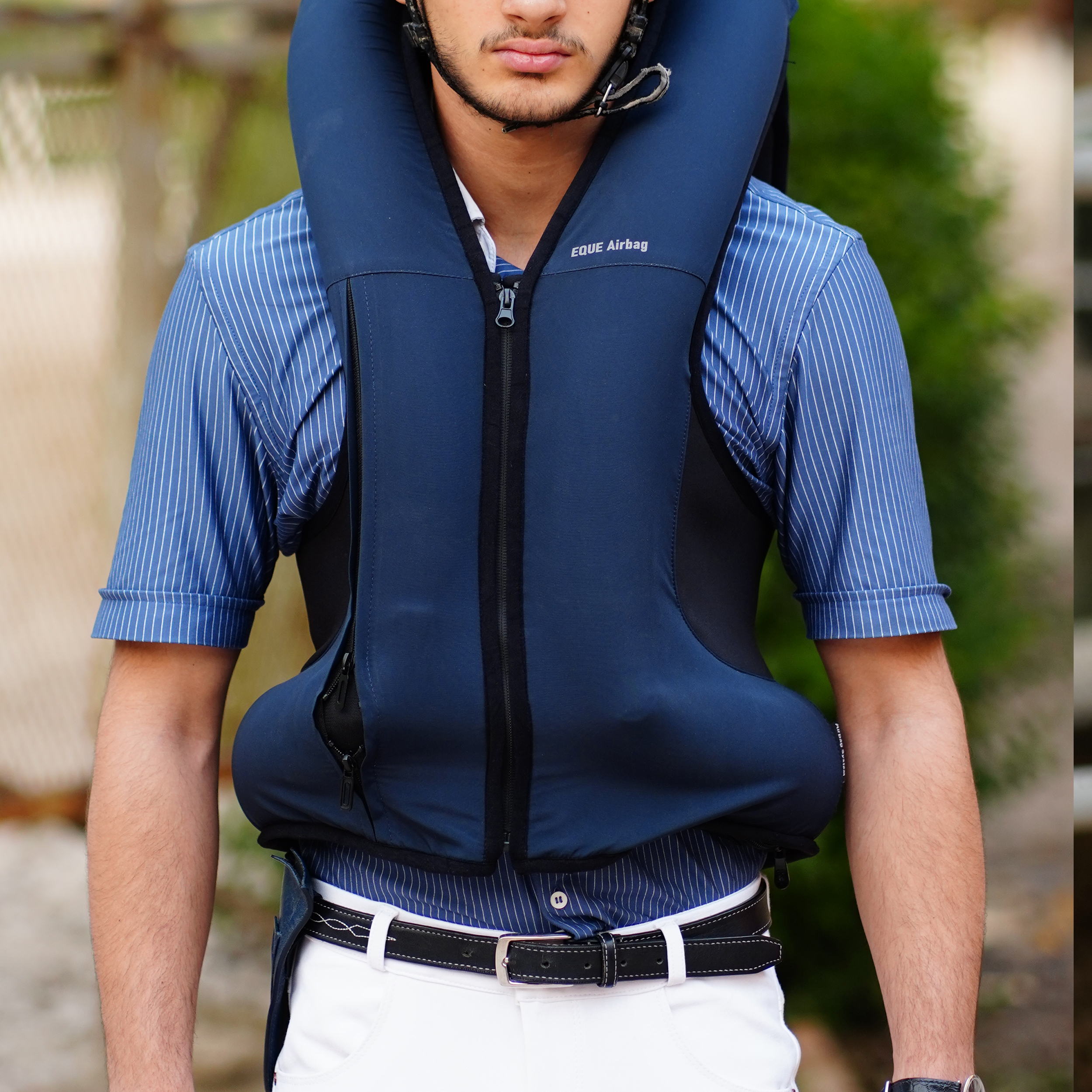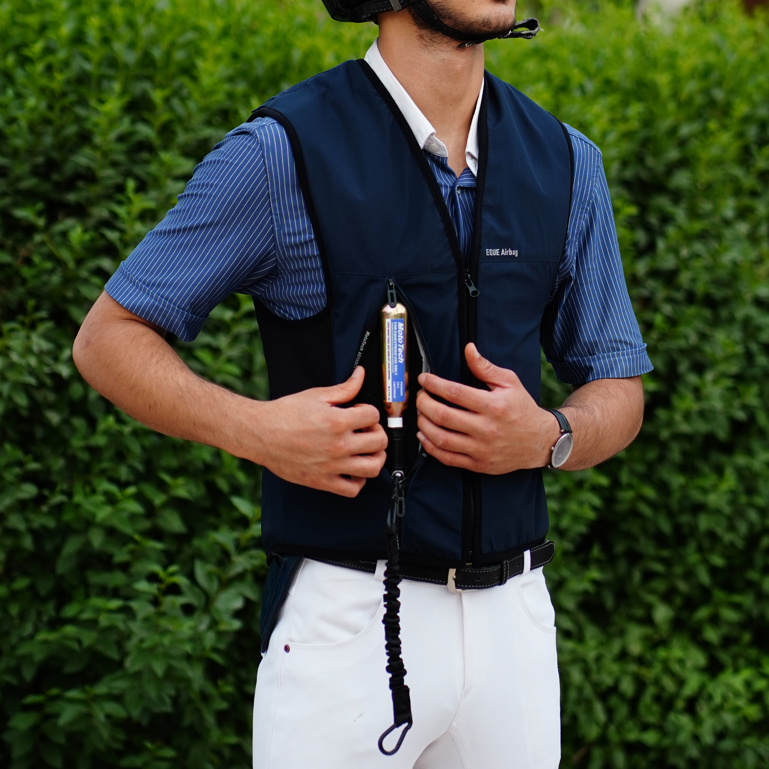 جلیقه اکویی ایربگ با استفاده از یک کابل اتصال (lanyard) به زین متصل میشود. در صورت جدا شدن ناگهانی سوارکار از زین، مکانیزم فعالسازی وارد عمل شده و ایربگ در کسری از ثانیه باز شده تا از بخش های حساس بدن محافظت نماید. پس از فعال شدن ایربگ، با تعویض کپسول گاز، جلیقه آماده استفاده مجدد خواهد بود.