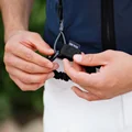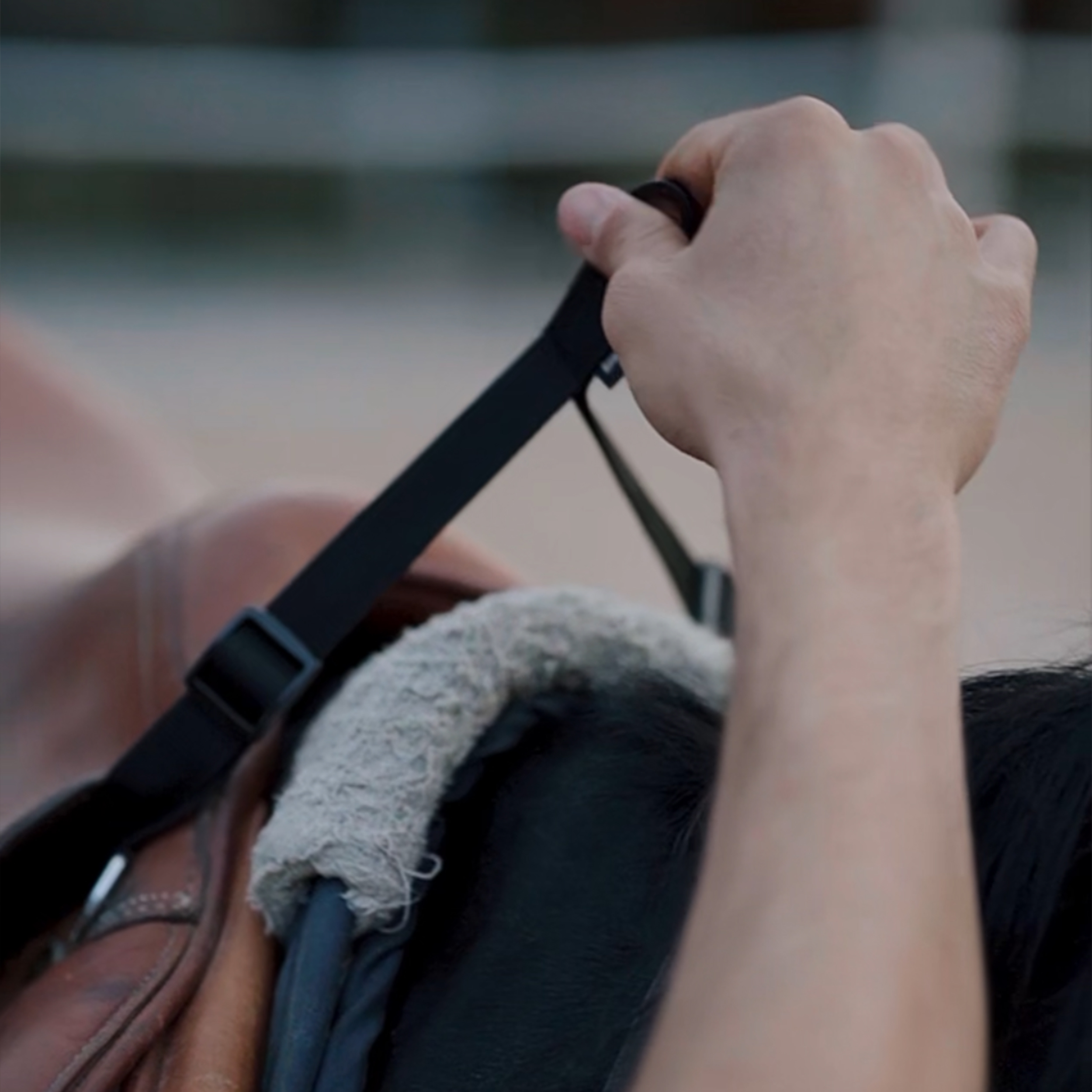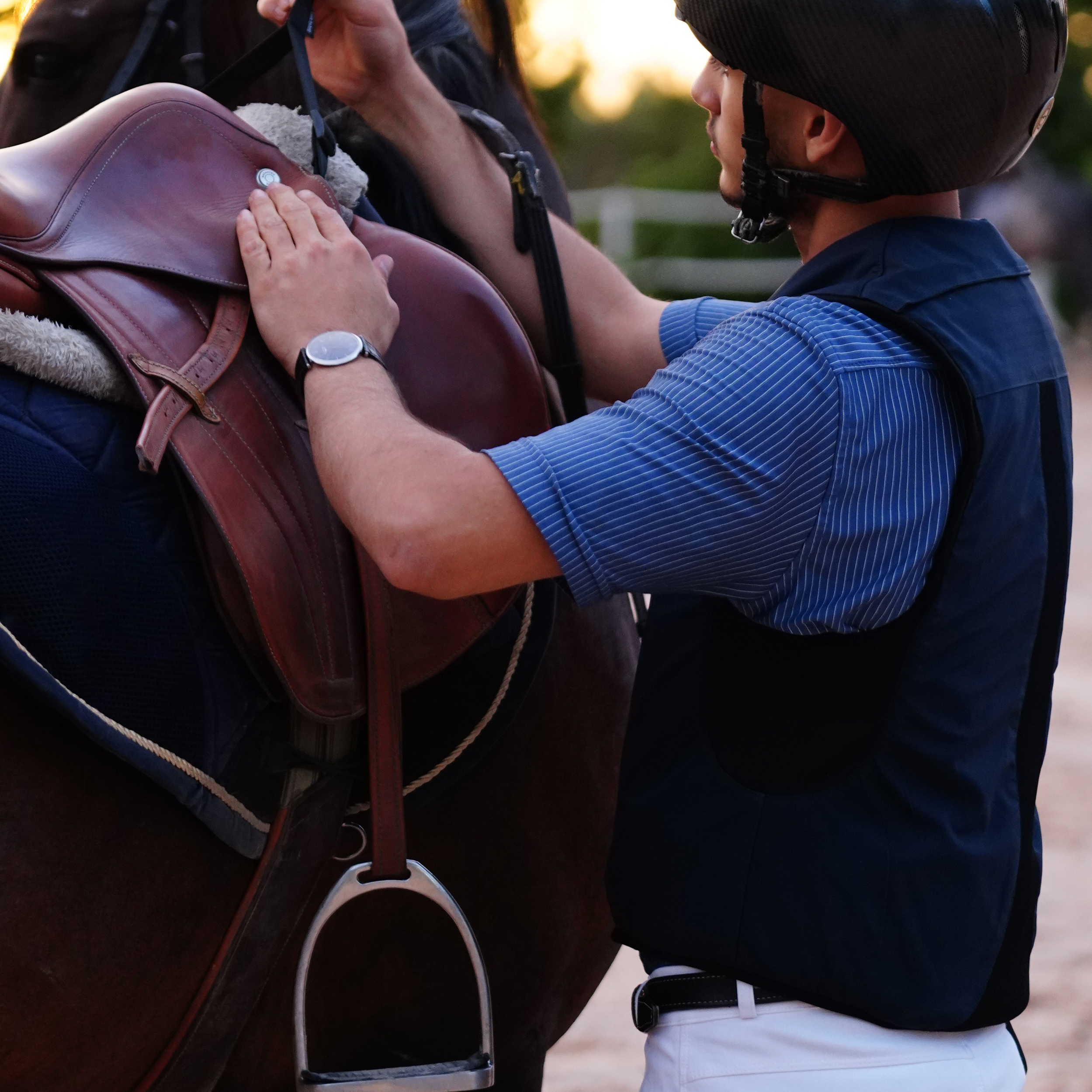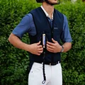 - جلیقه از طریق بند ایربگ (lanyard) به زین اسب متصل میشود.