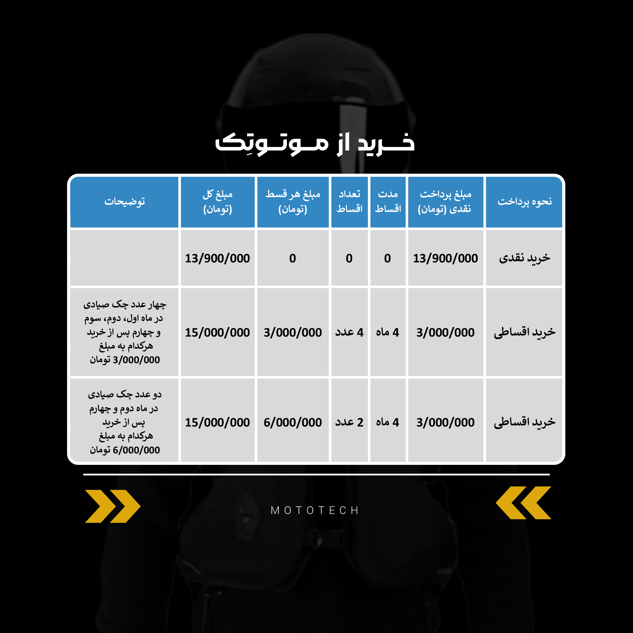 در موتوتِک، سلامت و امنیت موتورسواران عزیز برای ما اولویتی غیرقابل چشمپوشی است. جلیقههای ایربگ ما، با بهرهگیری از طراحی نوآورانه و تکنولوژی پیشرفته، برای محافظت از جان و سلامتی شما طراحی و ساخته شدهاند. با این حال، ما بهخوبی آگاهیم که هزینههای اولیه این تجهیزات ممکن است برای برخی افراد چالشبرانگیز باشد، از همین رو، با هدف انجام وظیفه و تسهیل دسترسی به این محصول حیاتی، امکان خرید اقساطی را برای شما فراهم کردهایم.